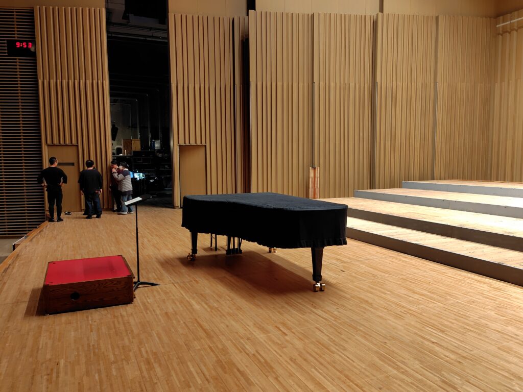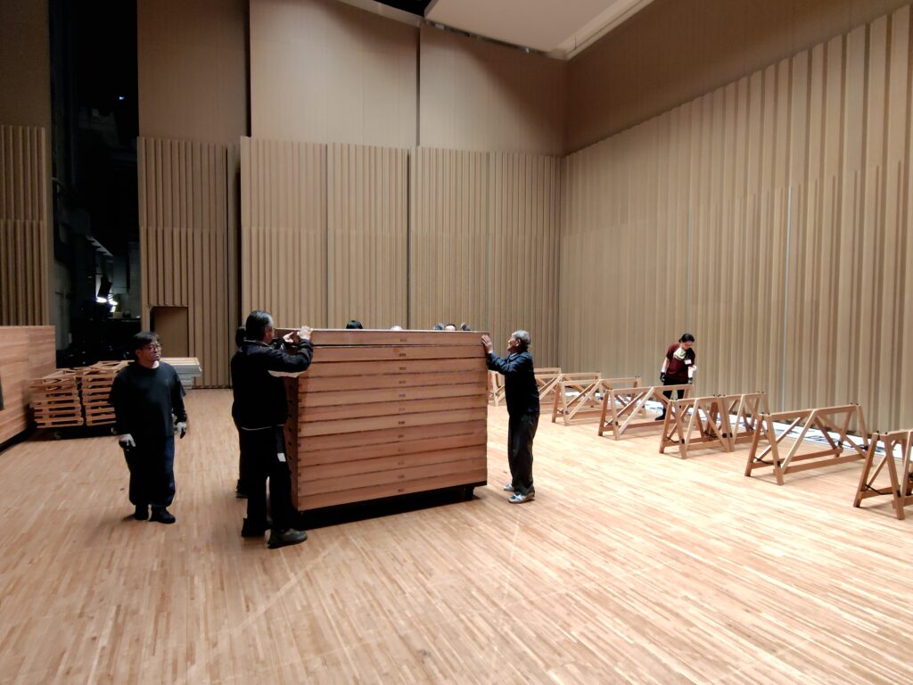 平台を組み終え、グランドピアノと指揮台を設置します。